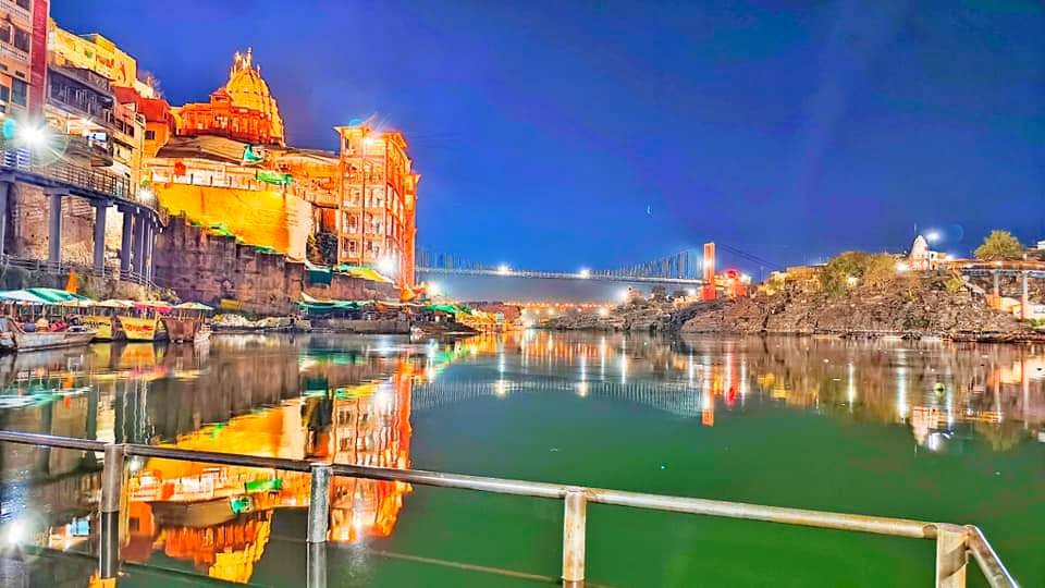 Omkareshwar is formed by the sacred river Narmada. This is one of the most sacred rivers in India and is now home to one of the world's largest solar power plant. The temple is situated on Mandhata or Shivpuri island on the banks of Narmada and Kaveri river (a tributary of Narmada).